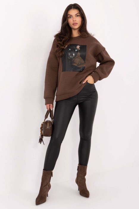 Długa bluza damska w stylu casual to idealna propozycja na co dzień wygodna, praktyczna i stylowa. Wykonana z miękkiej mieszanki bawełny i poliestru, zapewnia komfort noszenia oraz trwałość nawet przy częstym użytkowaniu. Model o dłuższym kroju doskonale sprawdza się w chłodniejsze dni, oferując ciepło i swobodę ruchów. Na przodzie znajduje się modny napis, który nadaje bluzie nowoczesnego charakteru i urozmaica jej minimalistyczny wygląd. Klasyczny, okrągły dekolt oraz długie rękawy sprawiają, że bluza jest uniwersalna i pasuje do wielu stylizacji. Wykończenie ściągaczami nadaje całości sportowego akcentu i pomaga utrzymać fason, a praktyczne kieszenie wsuwane w bocznych szwach zwiększają funkcjonalność, nie zaburzając przy tym estetycznego wyglądu. To idealna bluza do noszenia na co dzień, świetnie sprawdzi się z legginsami, jeansami czy spodniami dresowymi.